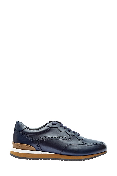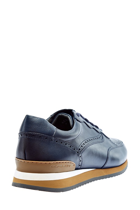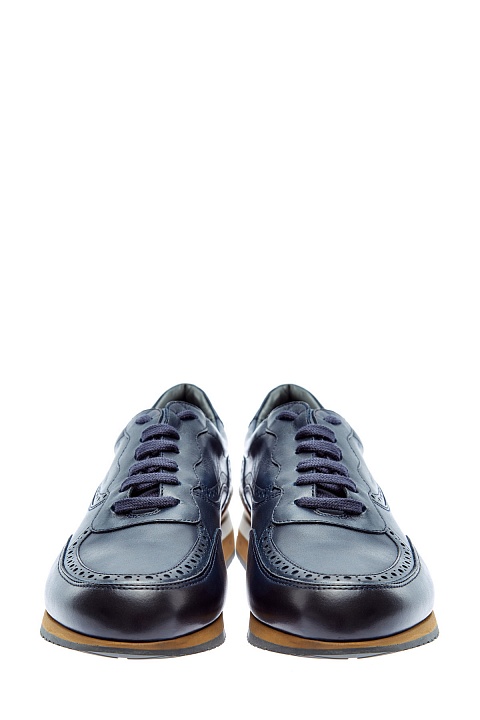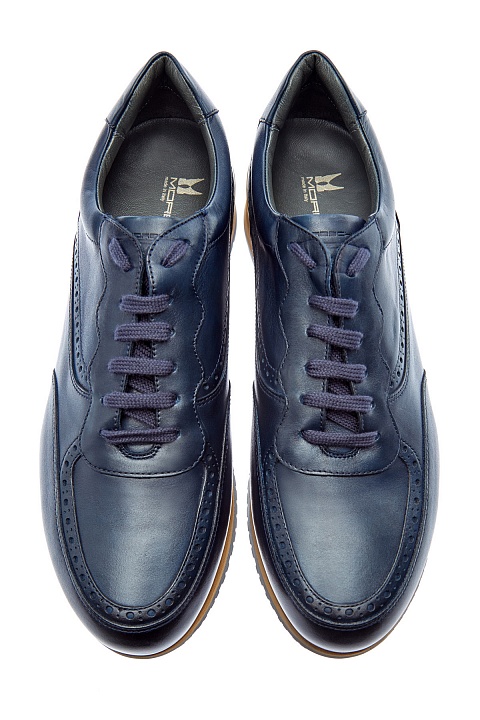 Стильные кроссовки от Moreschi из матовой телячьей кожи. Глубокий темно-синий оттенок достигнут мастерами бренда вручную. Брогированная отделка придает дизайну элемент классики, а массивная двухслойная подошва создает динамичный силуэт. Детали: фактурный рисунок протектора, внутренняя отделка из кожи, шнуровка в тон. Сделано в Италии.