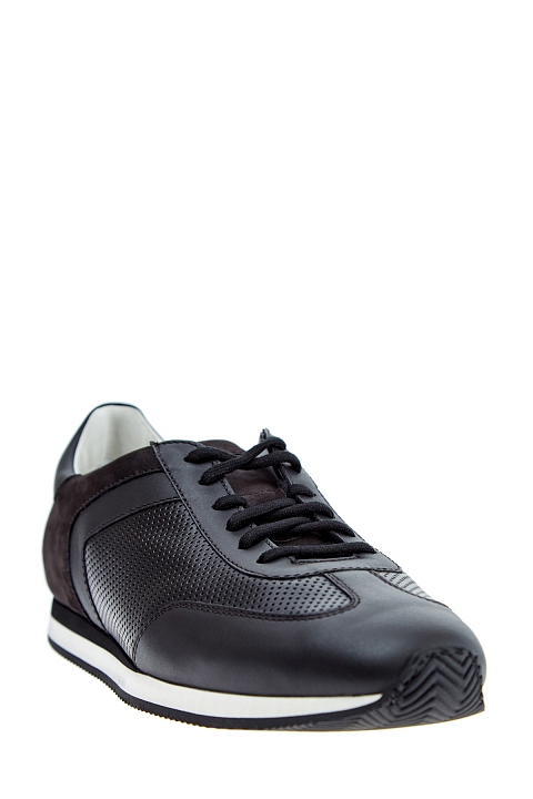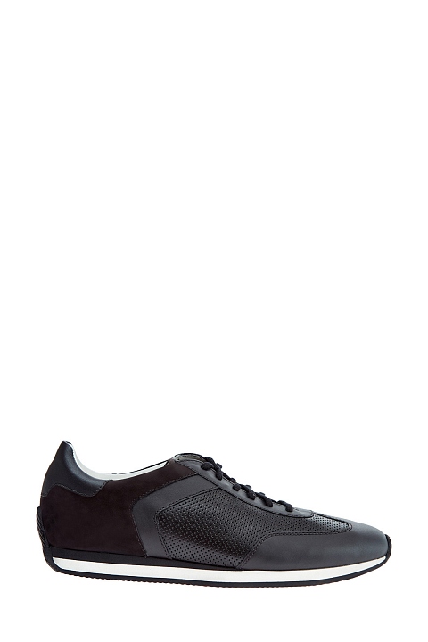 Стильные кроссовки от Santoni из коллаборации с Mercedes AMG выполнены из гладкой кожи и бархатистой замши в лаконичном черном цвете. Динамичный образ создают четкие линии, фигурный элемент на верхней панели и сложный крой. Детали: перфорированные вставки, двухцветная амортизирующая подошва, внутренняя кожаная отделка, логотип AMG на язычке, шнуровка в тон. Сделано в Италии.