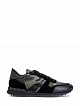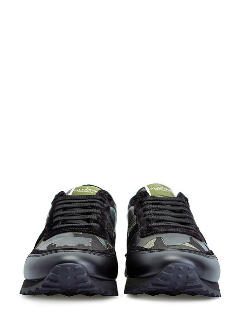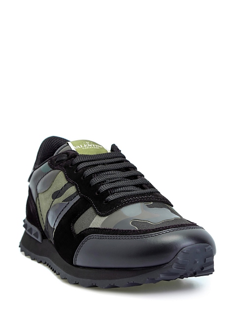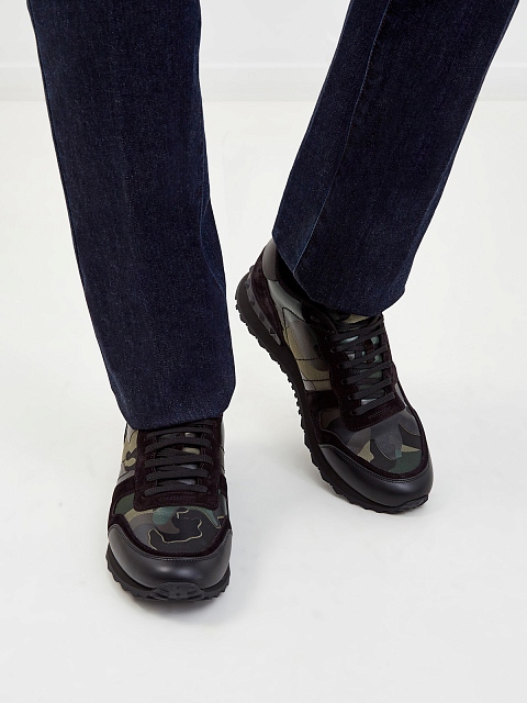 Мужские кроссовки Rockrunner от Valentino Garavani выполнены из кожи, замши и плотного текстиля. Фирменный камуфляжный мотив создан в контрастной защитной гамме, линии рисунка подчеркнуты нанесенным поверх принтом с эффектом кожаной поверхности. Детали: мембранная внутренняя отделка, силиконовая вставка с объемными шипами, фактурный узор на подошве. Сделано в Италии.