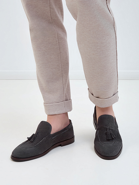 Элегантные мужские лоферы с кисточками от Brunello Cucinelli. Модель в стиле casual выполнена из натуральной замши — тонкой, бархатистой на вид кожи, обеспечивающей мягкую и легкую конструкцию. Кисточки добавляют утонченный элемент, который гармонично смотрится с зауженной формой обуви. Сделано в Италии.