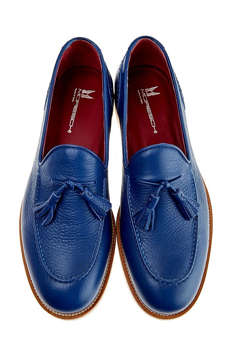 Лоферы от Moreschi выполнены из крупнозернистой телячьей кожи, однотонное исполнение подчеркивает натуральную фактуру материала. Мысок с традиционным объемным швом декорирован кисточками из кожи. Оригинальный образ завершает массивная подошва с рифленым узором протектора. Внутренняя кожаная отделка обеспечивает комфорт в течение дня. Сделано в Италии.