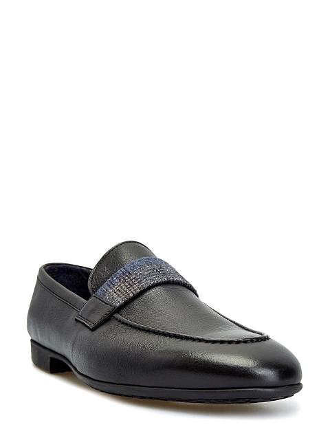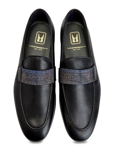 Мужские лоферы от Moreschi выполнены в универсальном черном цвете. Телячья кожа зернистой выделки и мягкая внутренняя поверхность обеспечивают комфорт в движении. Изделие дополнено вставкой из фактурного твида с узором в клетку. Детали: тисненый логотип с монограммой бренда, миндалевидный мысок. Сделано в Италии.