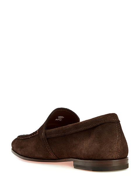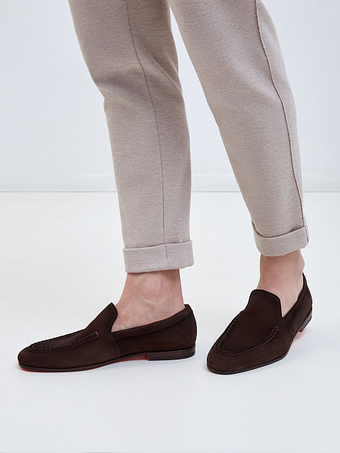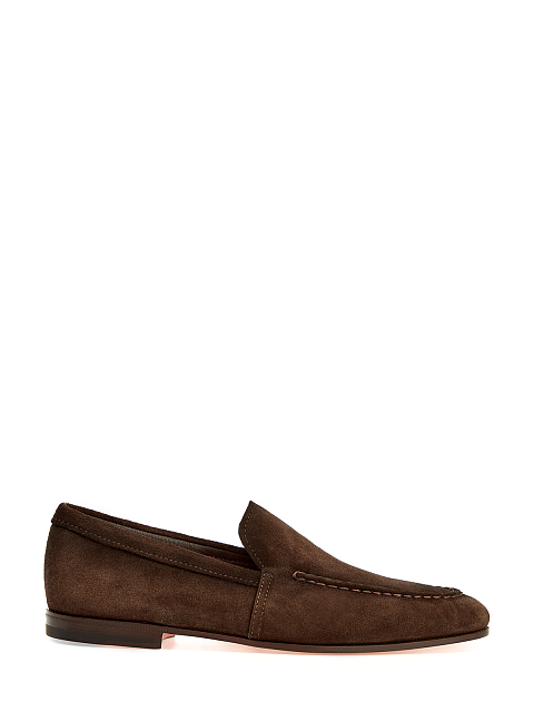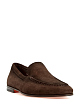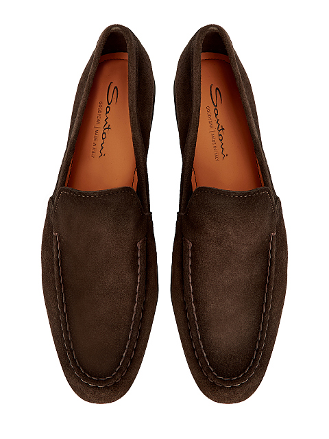 Лаконичные мужские лоферы от Santoni выполнены вручную из бархатистой замши в благородном коричневом оттенке. Верхняя панель обуви оформлена фактурным объемным швом в стиле sprezzatura. Детали: миндалевидный мысок, наборный невысокий каблук, фирменная оранжевая подошва. Сделано в Италии.