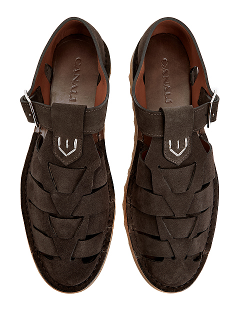Сандалии из мягкой замши с брендированной пряжкой и вышитой деталью