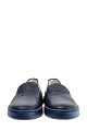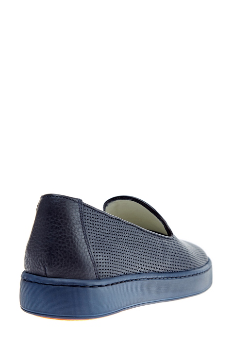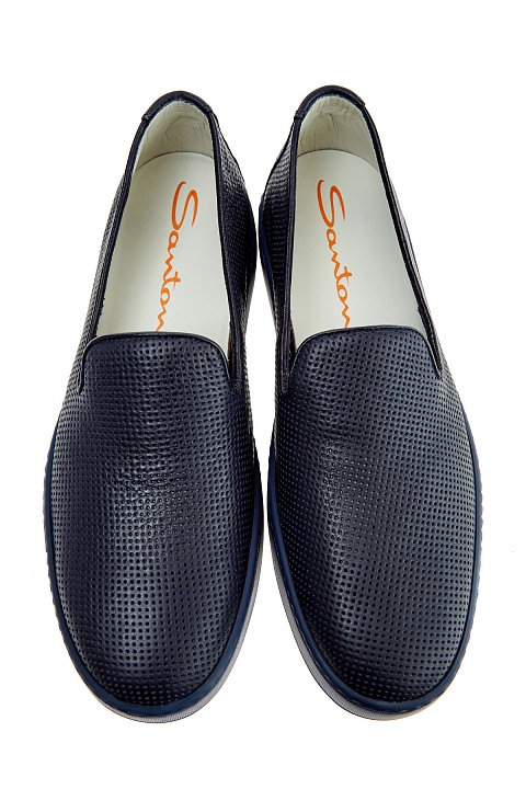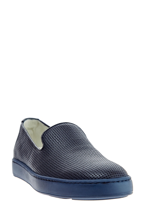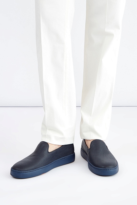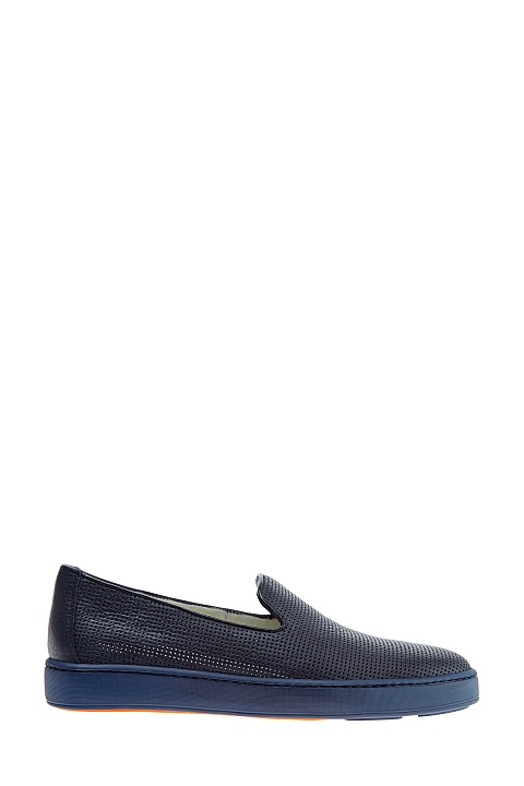 Лаконичные мужские слипоны от Santoni выполненные из гибкой кожи теленка насыщенного синего цвета с перфорированным узором. Модель с удлиненной союзкой и небольшими разрезами по бокам. Внутренняя отделка и стелька выполнены из кожи. Литая резиновая подошва дополнена вставкой контрастного оранжевого оттенка и фирменным логотипом. Сделано в Италии.