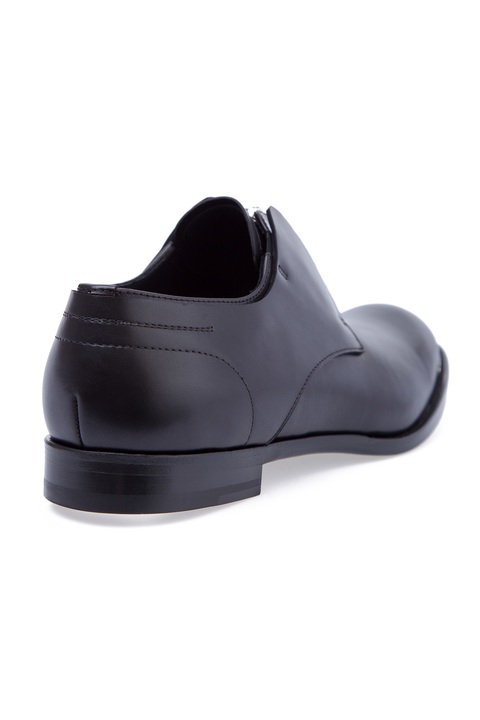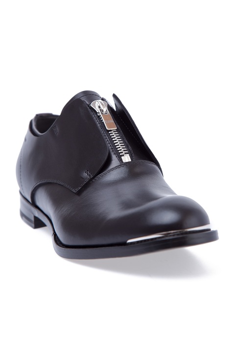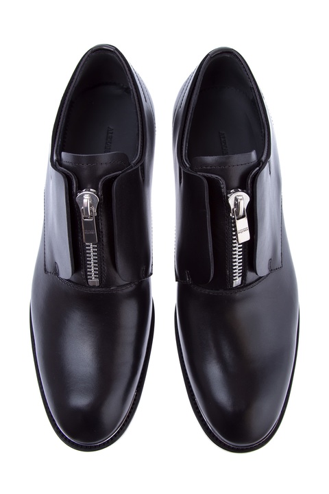 Лаконичные мужские дерби Alexander McQueen, выполненные из гладкой телячьей кожи черного цвета. Модель с круглым мыском, украшенным металлической вставкой характеризуется застежкой-молнией, заменяющей функциональную шнуровку. Изделие закрыто гибкой подошвой с квадратным устойчивым каблуком. Сделано в Италии.