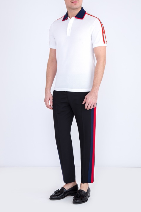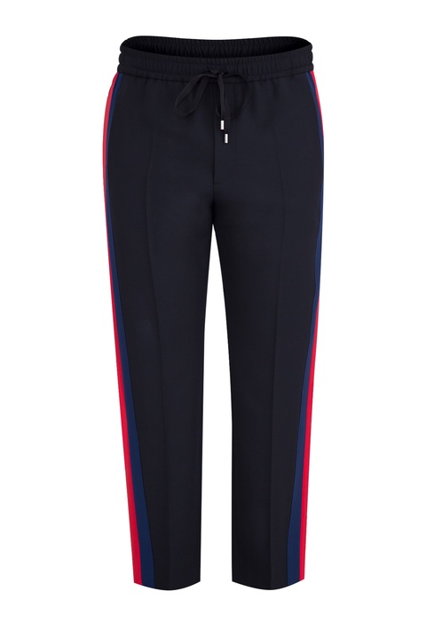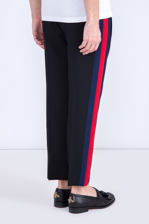 Укороченные мужские брюки слегка зауженного кроя из весенне-летней коллекции Gucci выполнены из дышащей хлопковой ткани черного цвета. Стрелки и лампасы фирменных красного и синего оттенков создают яркий образ в стиле спортшик. Пуговицы декорированы монограммой бренда на торцах. Модель с четырьмя прорезными карманами и поясом на кулиске. Сделано в Италии.