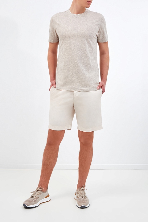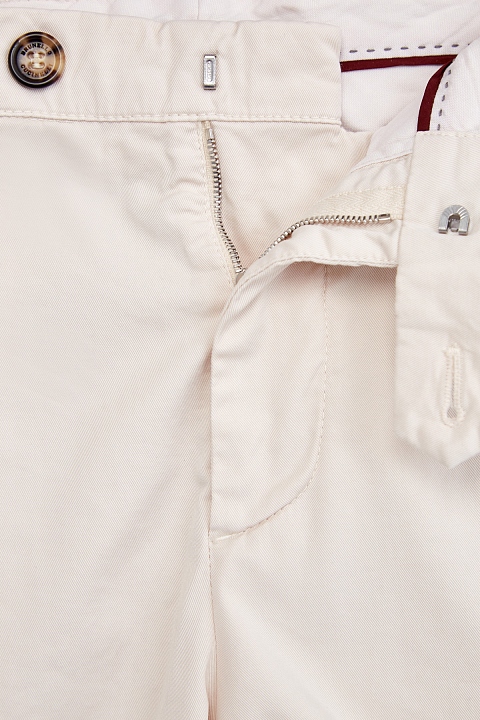 Мужские бермуды в стиле чинос от Brunello Cucinelli выполнены в базовом бежевом цвете из хлопковой ткани с бархатистой фактурой. Эластичные волокна в составе обеспечивают комфорт в движении. Модель с диагональными прорезными карманами по бокам и карманами с клапанами на спинке. Детали: асимметричная застежка на крючок, пуговицу и молнию, вытачки для посадки по фигуре. Сделано в Италии.
