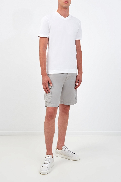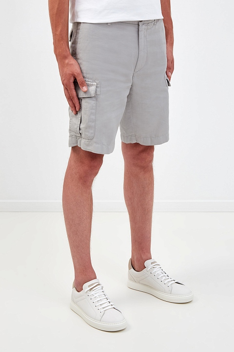Однотонные мужские бермуды от Eleventy выполнены в базовом сером оттенке. Натуральный лен и хлопок в составе изделия делают модель идеальным спутником в летний сезон. Акцент в стиле карго — объемные карманы с клапанами по бокам. Крой с вытачками обеспечивает идеальную посадку по фигуре. Детали: объемные швы, шесть карманов, застежка на пуговицу и молнию. Сделано в Италии.