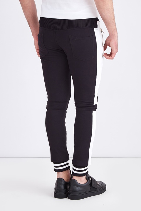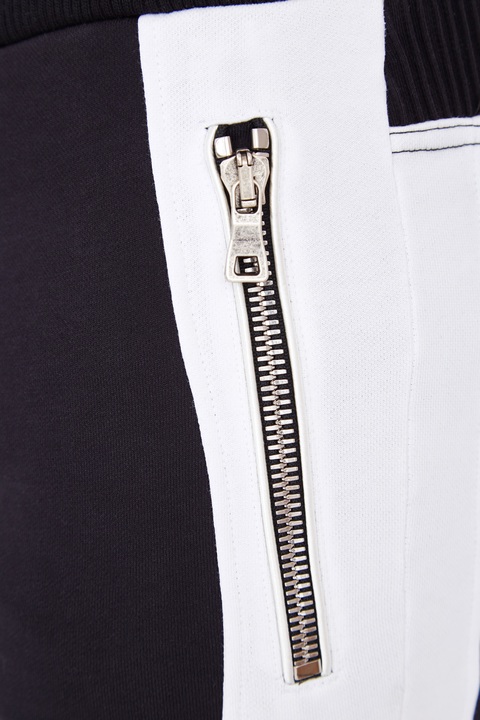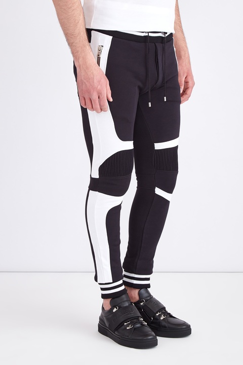 Эффектные мужские спортивные брюки из весенне-летней коллекции Balmain выполнены из плотного хлопка в черного тона. Модель сложного кроя декорирована контрастными элементами белоснежного оттенка и фактурными рифлеными вставками. Изделие оснащено двумя накладными и двумя прорезными карманами, а также манжетами английской вязки с узором в черно-белую полоску. Эластичный пояс с регулирующей кулиской и детали фурнитуры в оттенке «хром» завершают яркий образ.