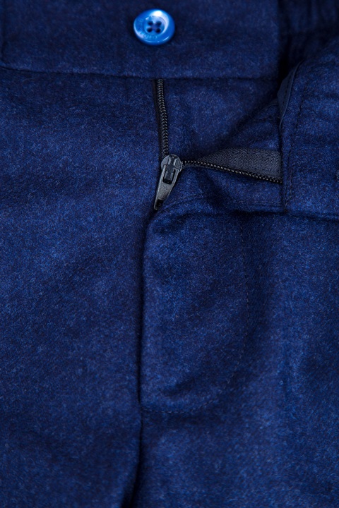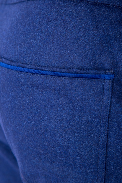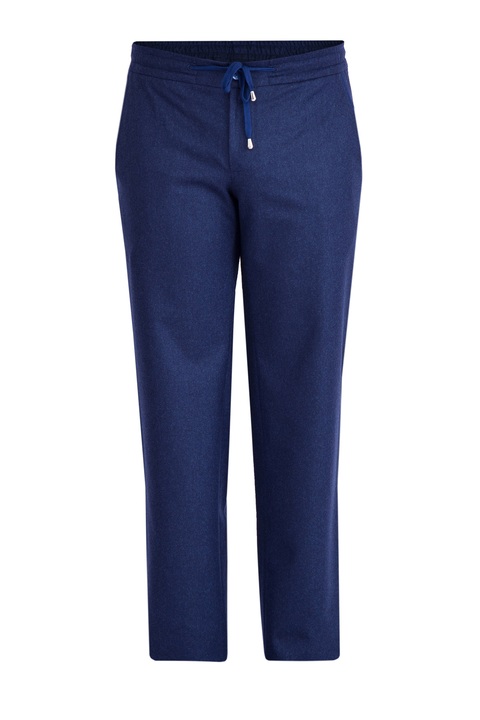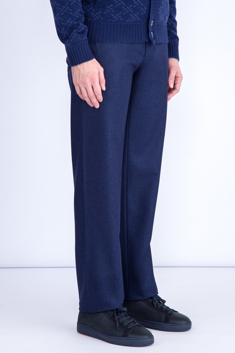 Стильные мужские брюки Bertolo Cashmere прямого кроя, выполненные из плотной шерсти с фактурной поверхностью синего цвета. Классический крой с прорезными карманами дополняет эластичный пояс с регулировочным шнурком и трикотажные вставки в тон. Сделано в Италии.