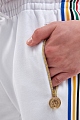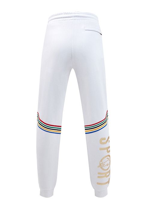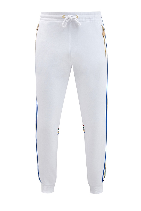 Мужские брюки-джоггеры в спортивном стиле от Bikkembergs выполнены в белом цвете. Для создания этой модели был выбран плотный хлопковый футер — дышащий материал, идеально сохраняющий форму изделия. Фактурная внутренняя отделка и пояс на регулируемой кулиске обеспечивают комфорт. Контрастные лампасы придают образу динамику, а также визуально удлиняют силуэт. Изделие дополнено объемной светоотражающей аппликацией Sport. Детали: эластичные манжеты, карманы на молниях с брендированной фурнитурой в золотом цвете, контрастные вставки на спинке.
