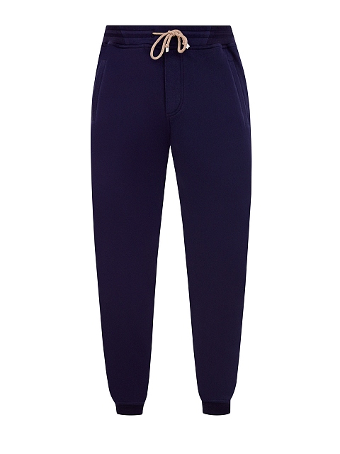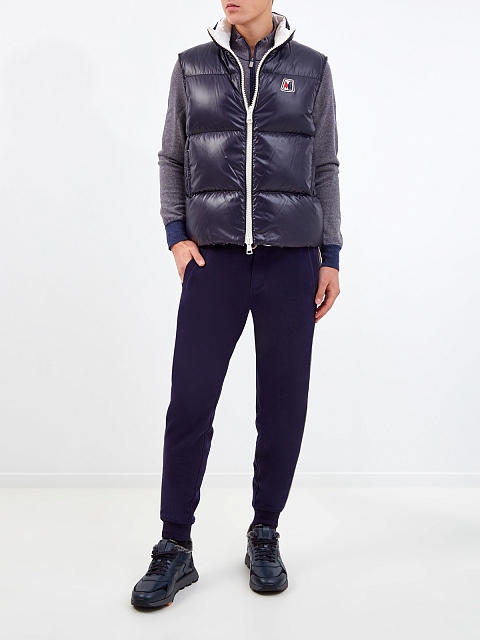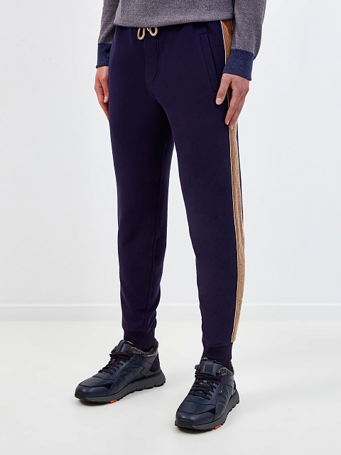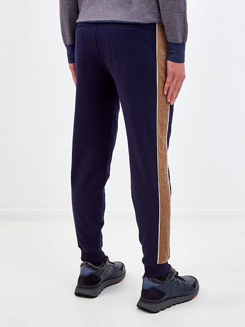 Брюки-джоггеры от Brunello Cucinelli вошли в линию для путешествий Travelwear. Хлопковый футер с волокнами эластана обеспечивает максимальный комфорт в движении. Фактурным акцентом стали лампасы из хлопкового вельвета, созданные в контрастном бежевом оттенке. Детали: эластичные манжеты, пояс на кулиске, прорезные карманы по бокам, карманы с пуговицами на спинке. Сделано в Италии.