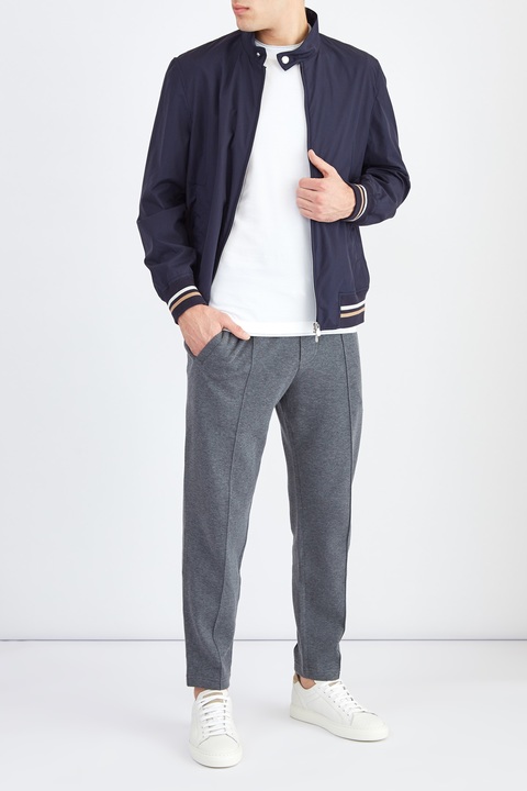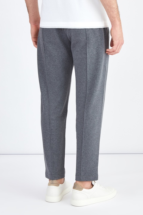 Мужские брюки прямого кроя от Brunello Cucinelli созданы из эластичного и мягкого трикотажного хлопка серого меланжевого цвета. Широкий пояс выполнен в технике английской резинки и оснащен шнуром-кулиской, обеспечивающим комфорт. Изделие дополнено функциональными прорезными карманами по бокам и на спинке, а также характерным для деловых моделей центральным швом-стрелкой. Сделано в Италии.