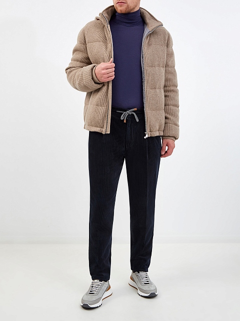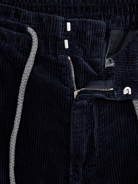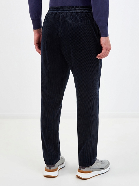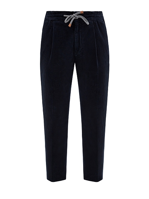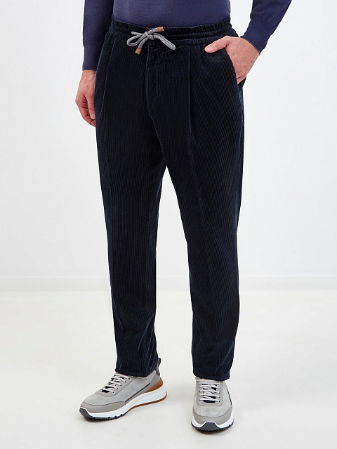 Мужские брюки в стиле sprezzatura от Brunello Cucinelli. Модель в глубоком оттенке индиго выполнена из фактурного хлопкового вельвета, заложенные складки придают изделию расслабленный штрих. Эластичный пояс на кулиске делает образ максимально комфортным. Детали: застежка на молнию на передней планке, четыре кармана. Сделано в Италии.