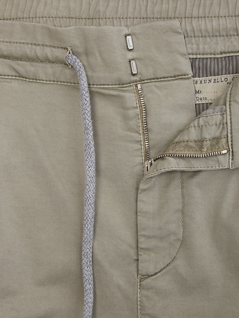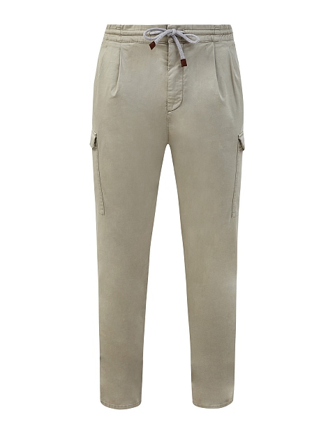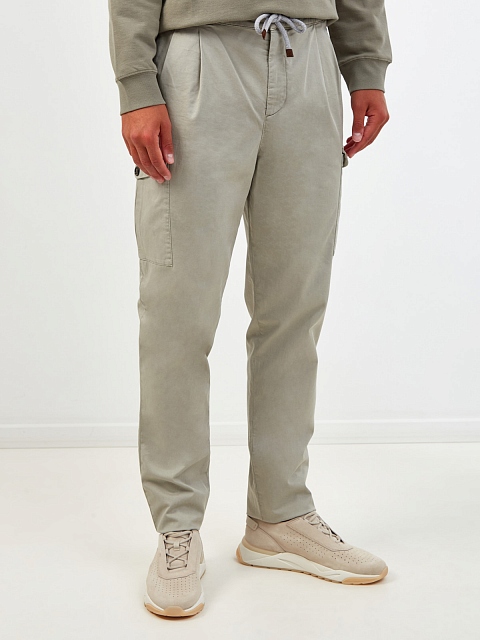Мужские брюки от Brunello Cucinelli выполнены из эластичного хлопкового габардина American Pima с характерным диагональным переплетением нитей. Объемные карманы в стиле карго, защипы от линии талии и пояс на регулируемой кулиске придают образу расслабленность. Детали: прорезные карманы, застежка на молнию и крючки. Сделано в Италии.