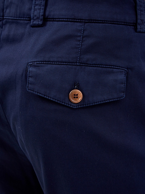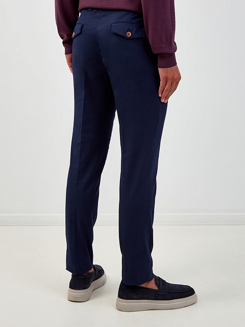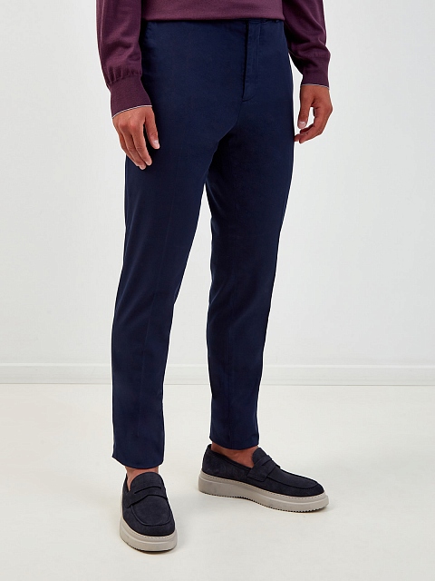 Лаконичные мужские брюки от Brunello Cucinelli выполнены в глубоком темно-синем оттенке. Минималистичный дизайн подчеркивает эластичный хлопковый габардин American Pima с характерным диагональным переплетением нитей. Техника окрашивания изделия в готовом виде придает поверхности легкий эффект размытости по кромкам. Детали: застежка на пуговицу с крючком и молнией, карманы с бортами на спинке, притачной пояс с петлями для ремня. Сделано в Италии.