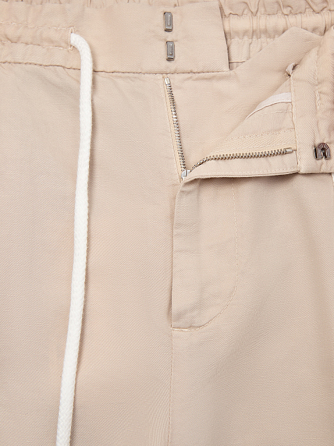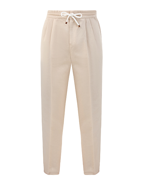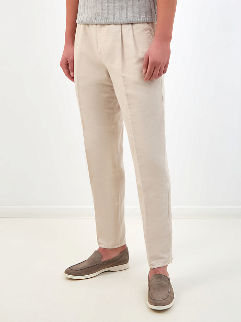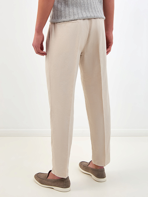 Брюки из льняного и хлопкового габардина с защипами и кулиской