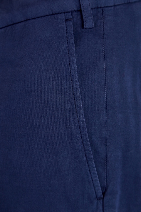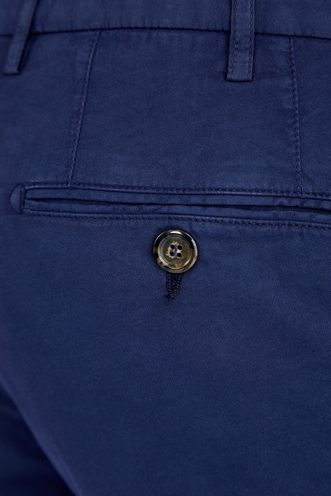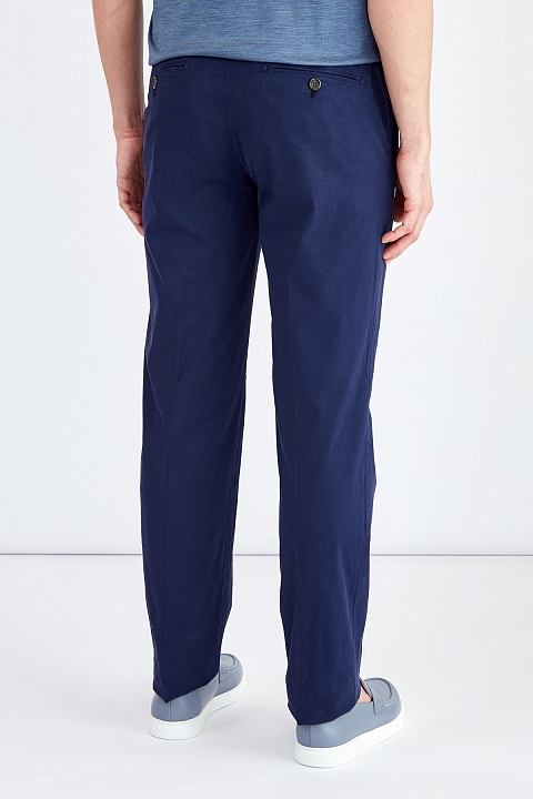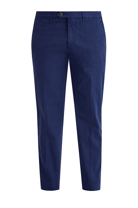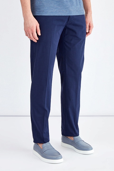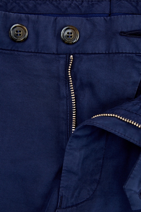 Минималистичные мужские брюки-чинос от Canali выполнены из хлопковой ткани с добавлением волокон шелка в базовом сапфирово-синем оттенке. Модель с диагональными прорезными карманами дополнена карманами с бортами и пуговицами на спинке. Детали: прямой крой, притачной пояс с петлями для ремня и асимметричной застежкой на потайную молнию и пуговицы. Сделано в Италии.