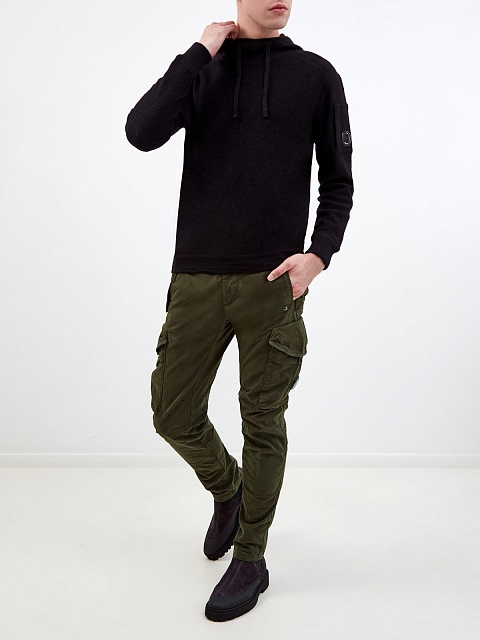 Оригинальные мужские брюки от C.P. Company созданы из эластичного хлопка с сатиновой текстурой. Модель комфортного зауженного кроя Ergonomic Fit дополнена двумя карманами-карго, фирменный стиль изделия подчеркивает культовая линза C.P. Company. Детали: шлевки для ремня, застежка на пуговицу и молнию, прорезные боковые карманы.