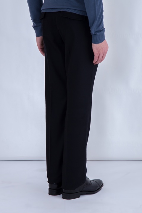 Элегантные мужские брюки Gucci, выполненные из эластичной костюмной шерсти глубокого черного цвета. Модель прямого кроя со стрелками и притачным конструктивным поясом с петлями для ремня. По бокам и сзади имеются прорезные карманы. Застежка осуществляется на пуговицу и молнию. Произведено в Италии.