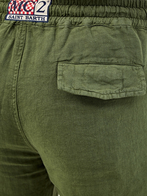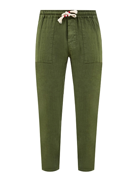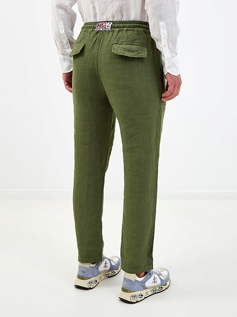 Мужские брюки от MC2 Saint Barth выполнены из натурального льна в оттенке хаки. Легкая ткань со слегка неоднородной текстурой идеально подходит для создания летних образов в стиле sprezzatura. Накладные карманы и регулируемая кулиска придают линиям расслабленное настроение. Детали: эластичный пояс для комфортной посадки, патч с логотипом на спинке.