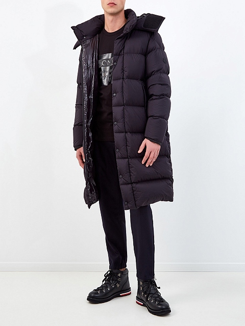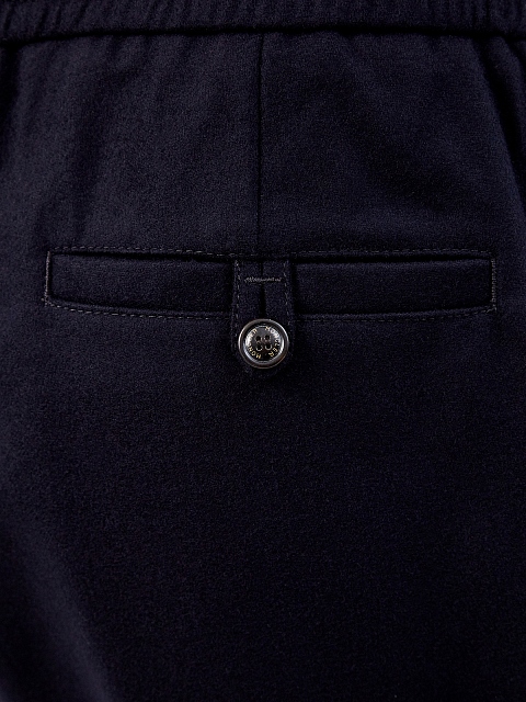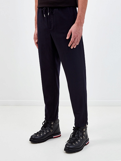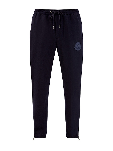 Зауженные брюки из мужской коллекции Moncler представлены в базовом темно-синем оттенке. Модель сочетает спортивный силуэт и классическую шерстяную фланель с peach-эффектом. Динамичный штрих — застежки-молнии по нижнему краю. Широкий пояс на кулиске обеспечивает комфортную посадку. Детали: два кармана по бокам и один на спинке, логотип из гибкого силикона в тон.