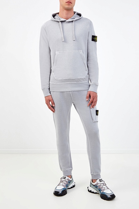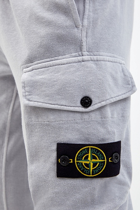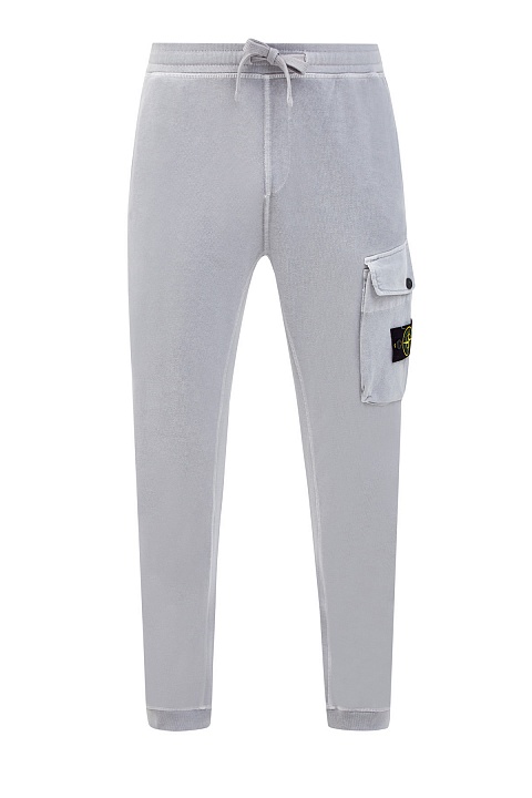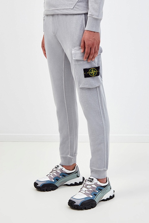Лаконичные мужские брюки-джоггеры в спортивном стиле от Stone Island выполнены в светло-сером оттенке. Для создания модели был выбран мягкий хлопковый футер — плотный дышащий материал, повторяющий движения тела. Фактурная внутренняя отделка и регулируемый пояс обеспечивают максимальный комфорт. Объемный карман с логотипом бренда в виде розы ветров придает образу динамичный акцент. Детали: простроченные швы, эластичные манжеты из трикотажа в рубчик.
