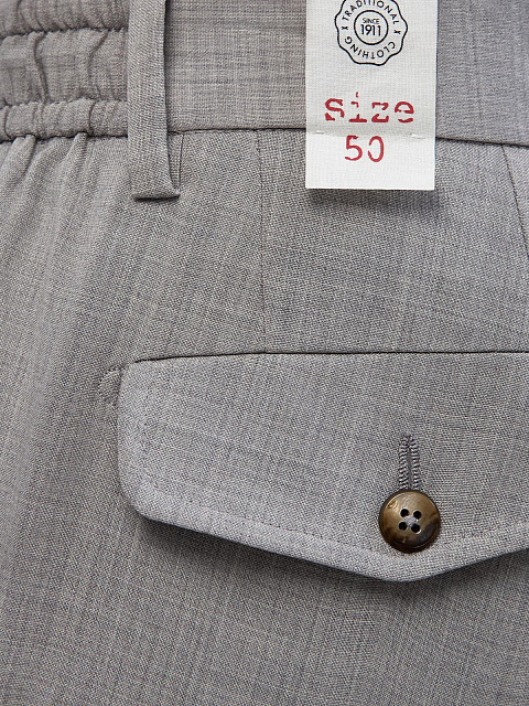 Костюмные брюки от L.B.M. 1911 созданы из тонкой и гибкой шерстяной ткани. Классическая модель в меланжево-сером оттенке дополнена элементами в стиле sprezzatura: диагональными прорезными карманами по бокам и карманами с бортами на спинке, а также поясом с регулируемой кулиской и эластичной вставкой. Комфорт обеспечивает мягкая внутренняя отделка швов, заложенные складки придают изделию нотку фирменной итальянской роскоши. Сделано в Италии.