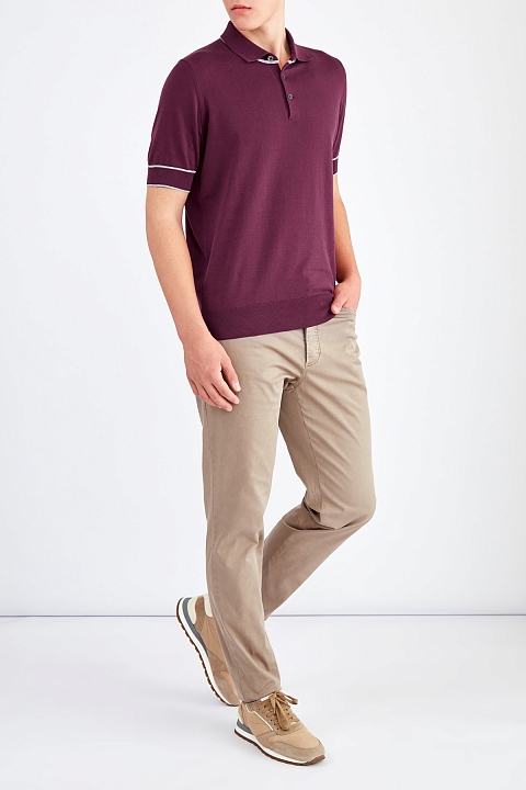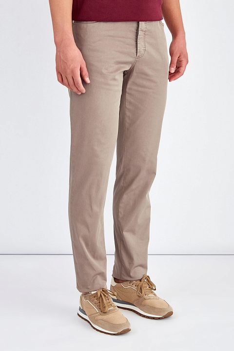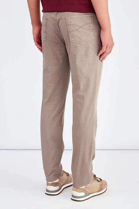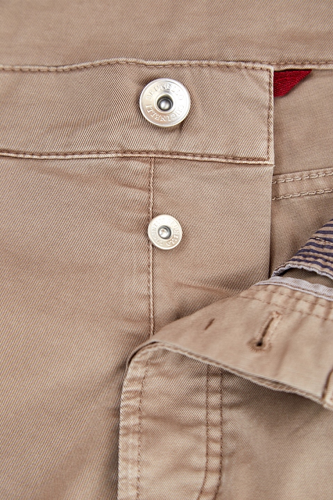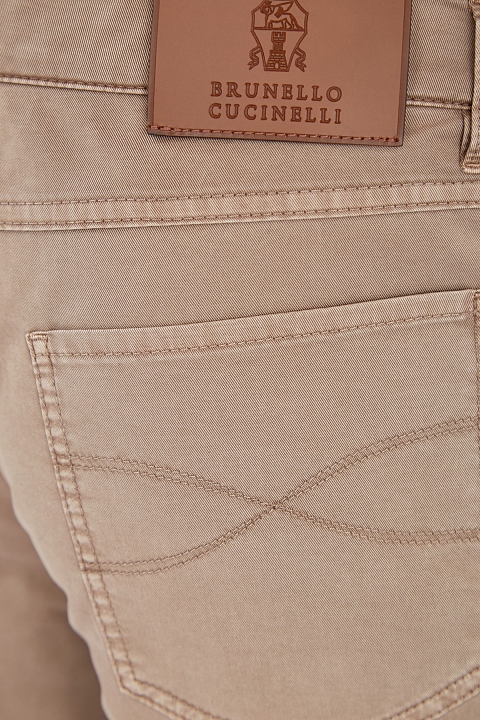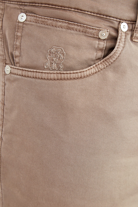 Базовые джинсы от Brunello Cucinelli выполнены из хлопкового габардина American Pima холодного коричневого оттенка — за счет эластичных волокон в составе ткань не стесняет движений, а гладкость фактуры придает поверхности легкий блеск. Техника окрашивания изделия в готовом виде придает поверхности легкий эффект размытости по кромкам. Модель облегающего кроя дополнена традиционными пятью карманами, нашивкой на поясе с тисненым логотипом и застежкой на пуговицы. Сделано в Италии.