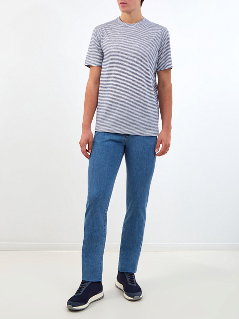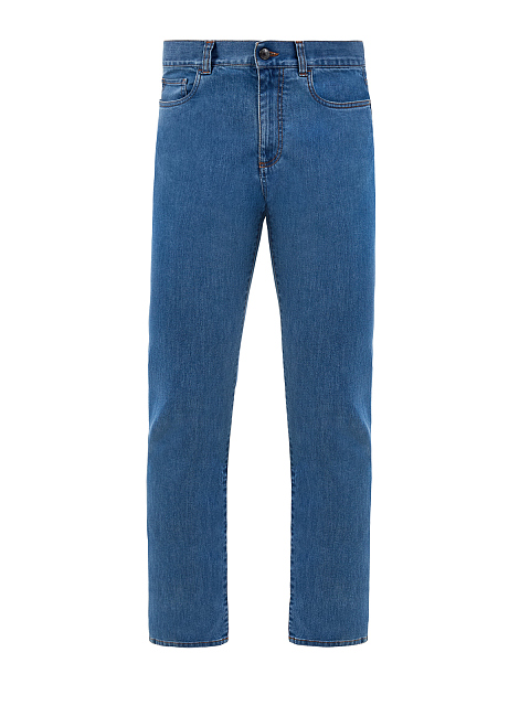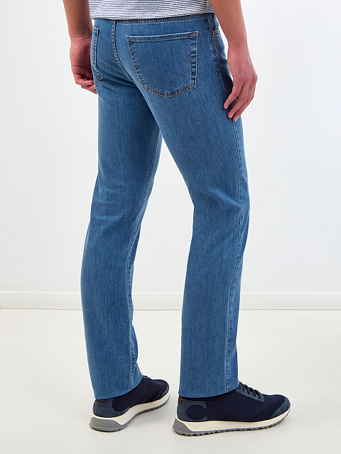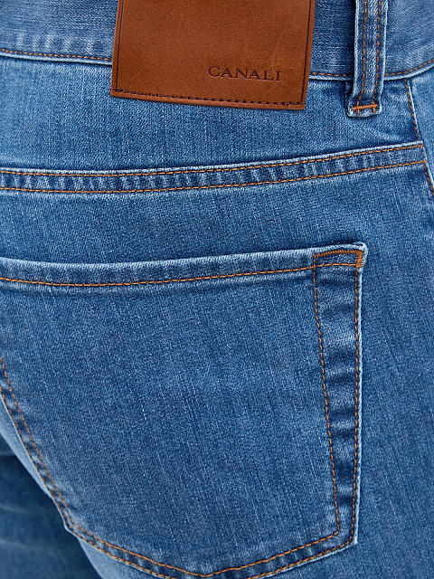 Мужские джинсы от Canali выполнены из хлопкового денима с добавлением эластичных волокон для комфортной посадки. Изделие в небесно-синем оттенке дополнено прострочкой швов нитью цвета охры, а также литой фурнитурой ручной работы. Детали: застежка на пуговицу и молнию, пять карманов, нашивка из кожи на поясе. Сделано в Италии.
