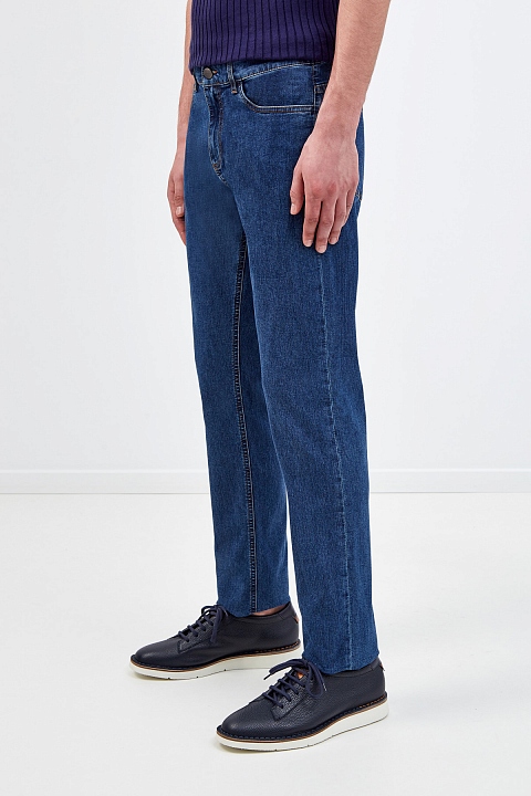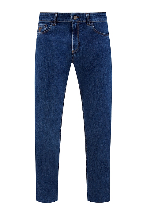 Джинсы ручной работы от Canali выполнены из тонкого и эластичного денима. Крой Tapered Fit, свободный в области бедер и облегающий по длине, обеспечивает комфортную посадку по фигуре. Ткань сочетает два цвета нитей и окрашивание в готовом виде создает графический эффект по поверхности и легкую потертость в области швов. Детали: нашивка из кожи на спинке, контрастная прострочка швов, фурнитура ручной полировки. Сделано в Италии.