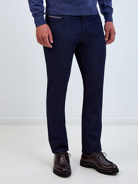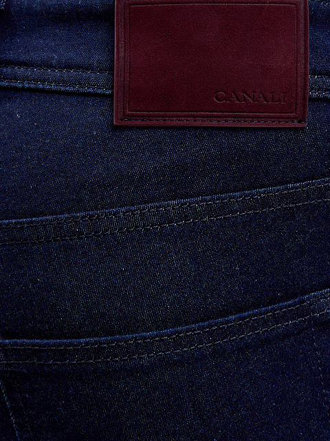 Мужские джинсы кроя Slim Fit от Canali выполнены мастерами бренда вручную, хлопковый деним с добавлением эластичных волокон сохраняет комфорт в движении. Динамичный акцент в образ вносит контрастная деталь в полоску на переднем кармане и нашивка из замши с тиснением на поясе. Сделано в Италии.