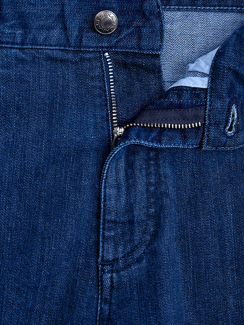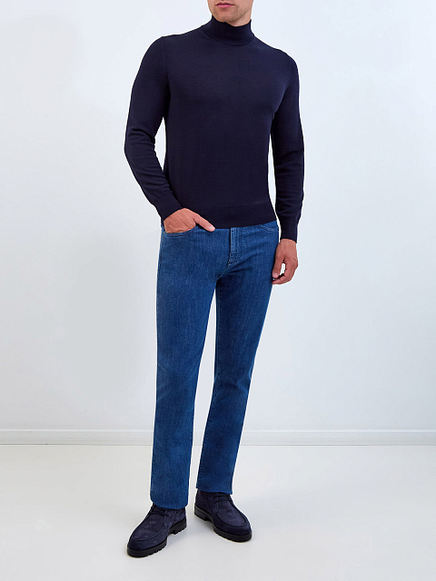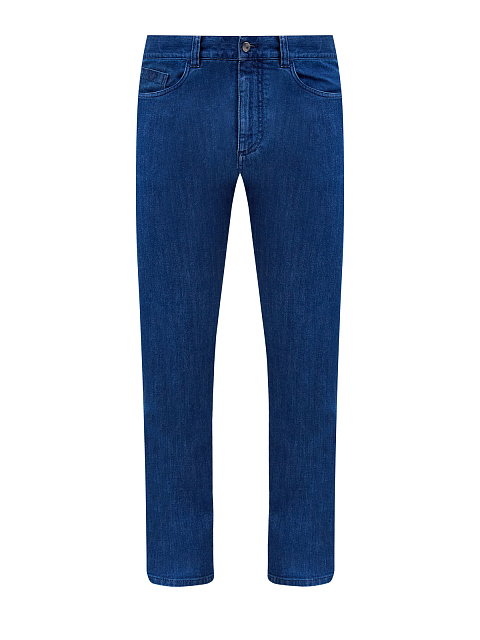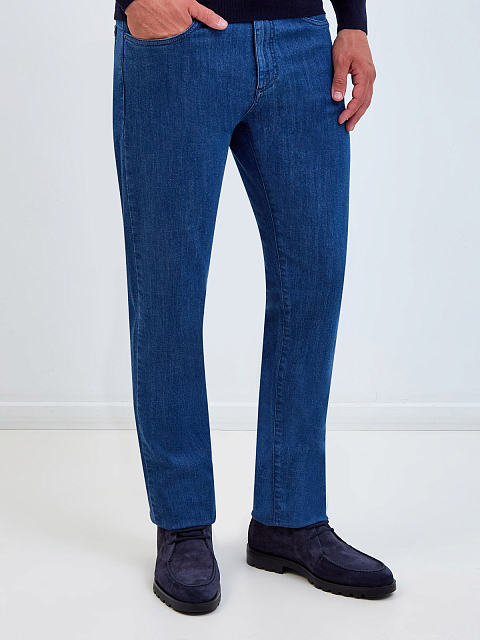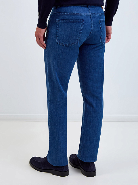Мужские джинсы от Canali выполнены из хлопкового денима с добавлением эластичных волокон для комфортной посадки. Изделие в классическом синем оттенке дополнено прострочкой швов нитью в тон, а также брендированной фурнитурой ручной работы. Детали: застежка на пуговицу и молнию, пять карманов, нашивка из гладкой кожи на поясе. Сделано в Италии.