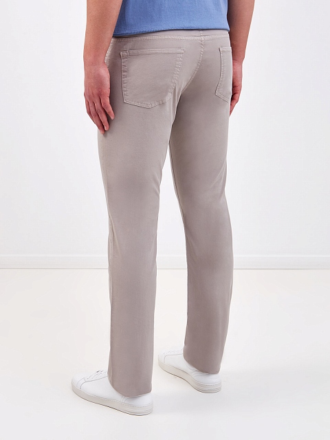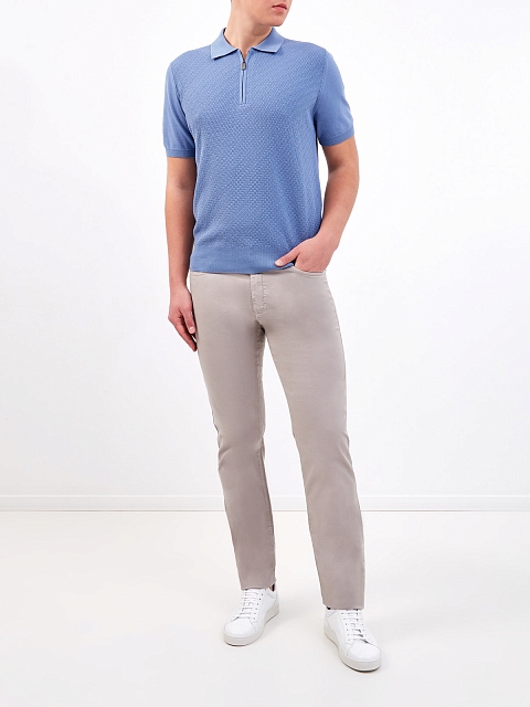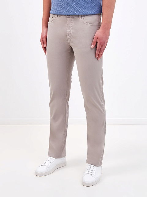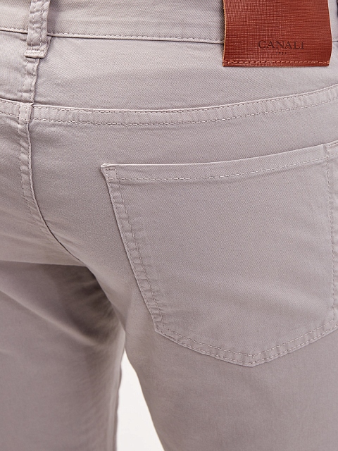Джинсы из легкого денима от Canali. Выверенный состав ткани со stretch-волокнами обеспечивает комфорт в движении без ущерба для ценных свойств натурального материала. Однородный кремовый оттенок подчеркнут прострочкой швов в тон и фирменной нашивкой из сафьяновой кожи на поясе. Детали: пять карманов, классическая средняя посадка, застежка на пуговицу и молнию. Сделано в Италии.