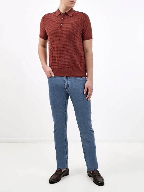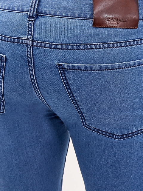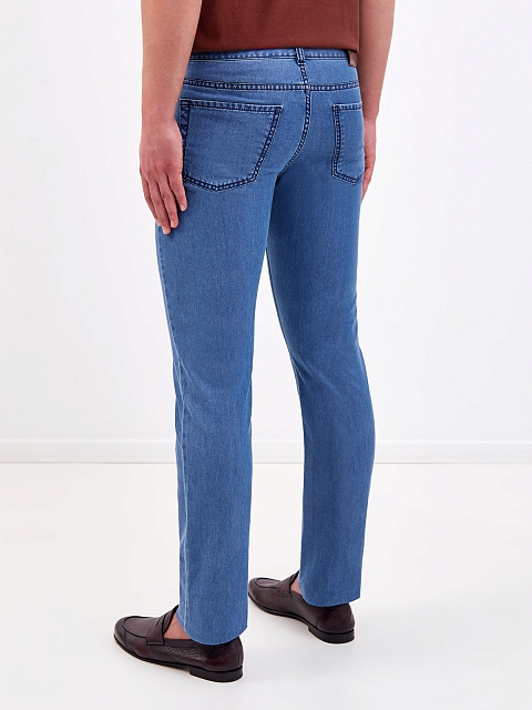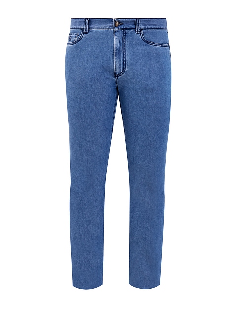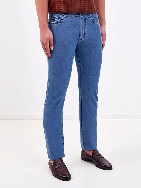 Мужские джинсы-slim от Canali выполнены из легкого денима. Выверенный состав на основе хлопка и ценных волокон кашемира обеспечивает комфорт в движении и делает материал тактильно приятным. Модель в небесно-синем оттенке с легким эффектом потертости на швах дополнена вышитым логотипом бренда и контрастной прострочкой. Нашивка из кожи на поясе завершает дизайн. Сделано в Италии.