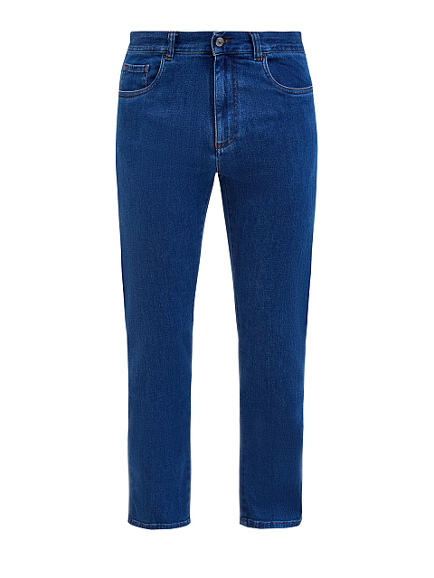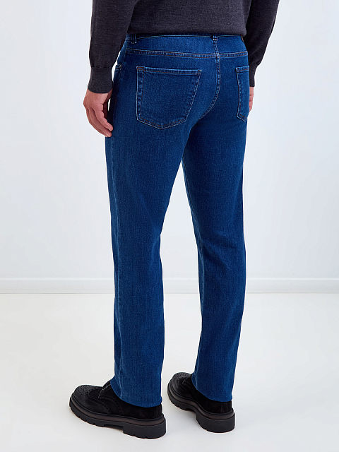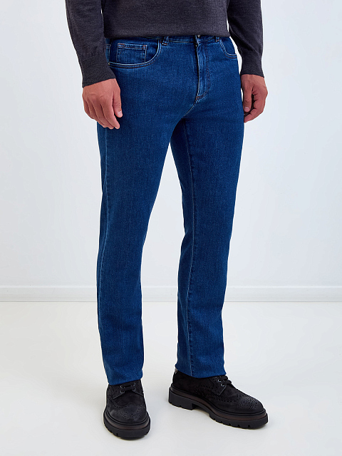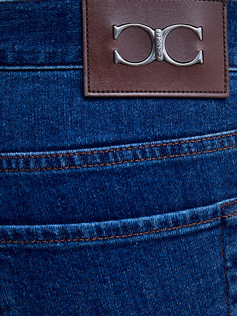 Мужские джинсы от Canali выполнены из хлопкового денима — плотная ткань с добавлением благородных волокон кашемира делает модель идеальной основой для создания повседневных аутфитов. Классический синий оттенок достигнут мастерами бренда вручную, расслабленный акцент в образ вносит контрастная прострочка швов, нашивка из кожи на поясе и объемный логотип на заднем кармане. Детали: пять карманов, застежка на молнию и пуговицу. Сделано в Италии.
