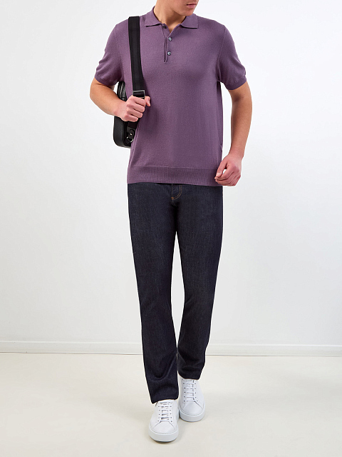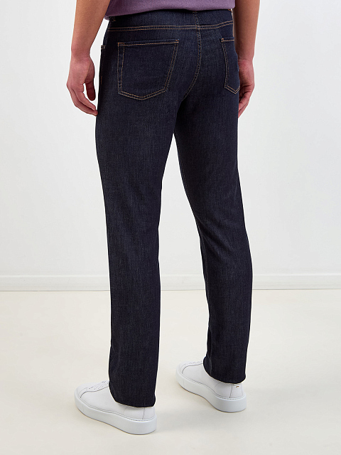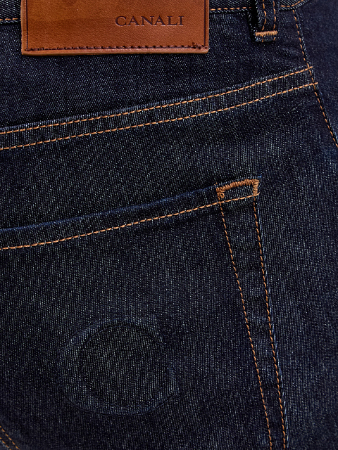 Мужские джинсы от Canali выполнены из окрашенного вручную денима в темно-синем оттенке. Выверенный состав на основе лиоцелла, хлопка и шелка обеспечивает комфорт в движении и делает материал тактильно приятным. Модель с легким эффектом потертости дополнена контрастной прострочкой швов, объемная символика на заднем кармане подчеркивает фирменный стиль изделия. Сделано в Италии.