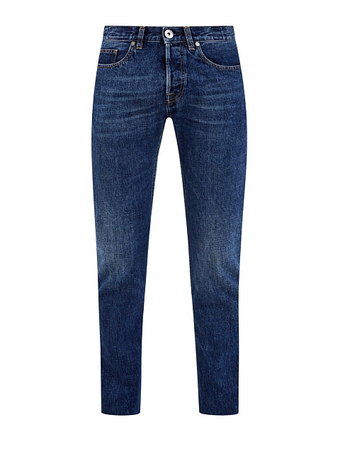 Стильные мужские джинсы зауженного кроя от Eleventy выполнены из хлопкового денима. Модель в классическом синем цвете с легким выбеленным эффектом идеально подходит для создания повседневных образов. Расслабленный акцент вносит контрастная прострочка швов нитью оттенка охры. Детали: застежка на пуговицы с серебристым напылением, пять карманов. Сделано в Италии.