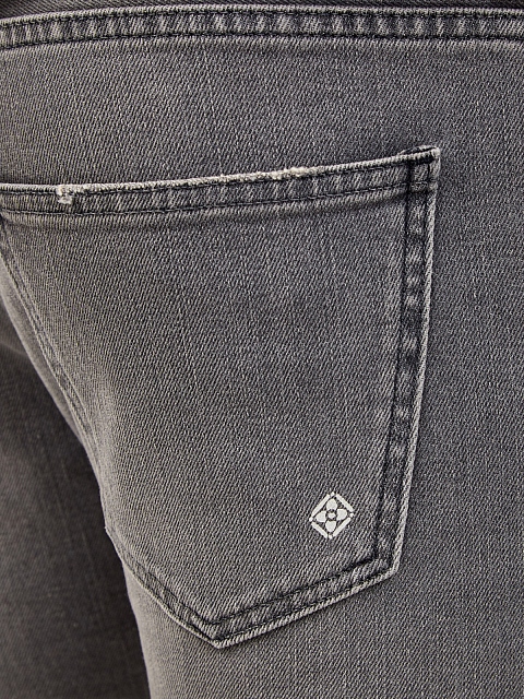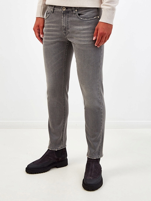 Мужские джинсы укороченного кроя от Eleventy выполнены из эластичного денима. Неоднородный серый оттенок с выбеленным эффектом подчеркивает расслабленный стиль изделия, потертости на швах придают образу настроение в стиле sprezzatura. Детали: пять карманов, брендированная фурнитура, логотип на заднем кармане. Сделано в Италии.