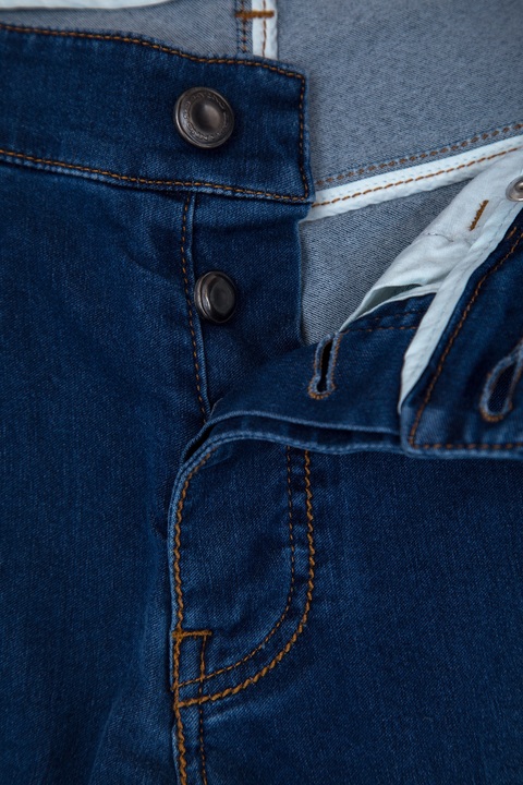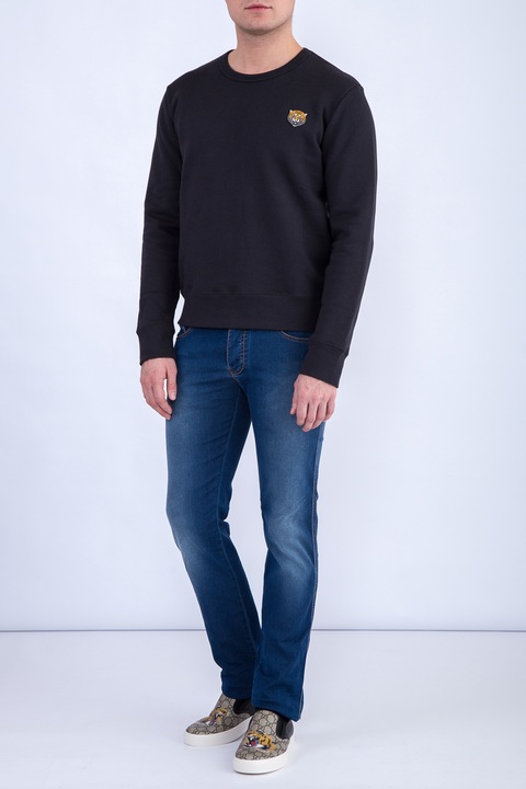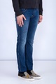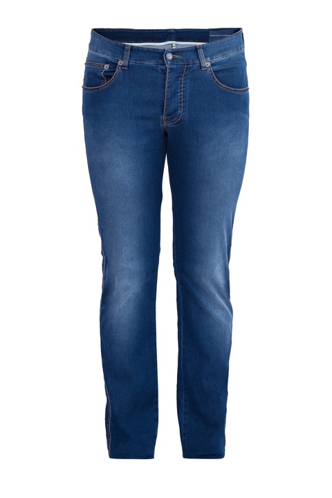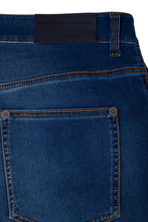 Классические мужские джинсы Ermanno Scervino зауженного кроя. Модель выполнена из плотного хлопкового денима синего цвета с легким высветлением, создающим эффект делаве. Изделие с традиционными пятью карманами и притачным поясом, дополненным кожаным лейблом. Сделано в Италии.