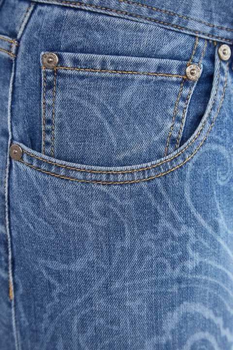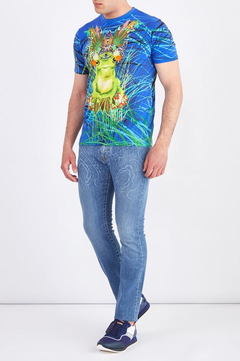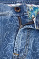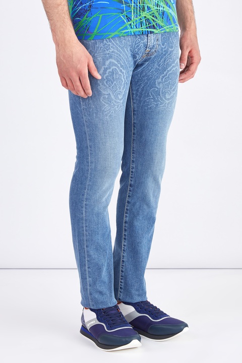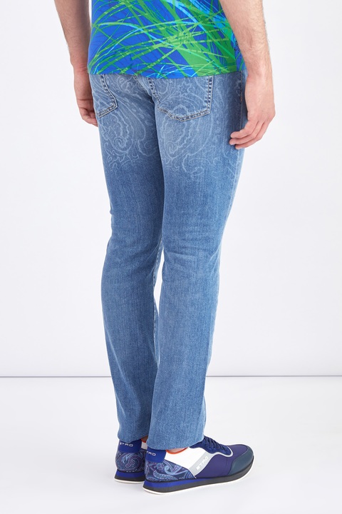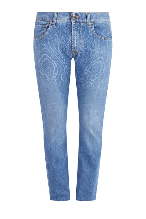 Эффектные мужские джинсы облегающего кроя из весенне-летней коллекции Etro выполнены из дышащего хлопкового денима в светло-голубом оттенке с декоративно выбеленными трафаретными участками с этническим мотивом. Изделие с притачным поясом с петлями для ремня и пятью карманами. Застежка на пуговицу и молнию завершает изделие. Сделано в Италии.