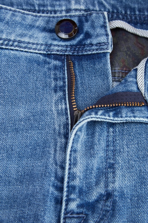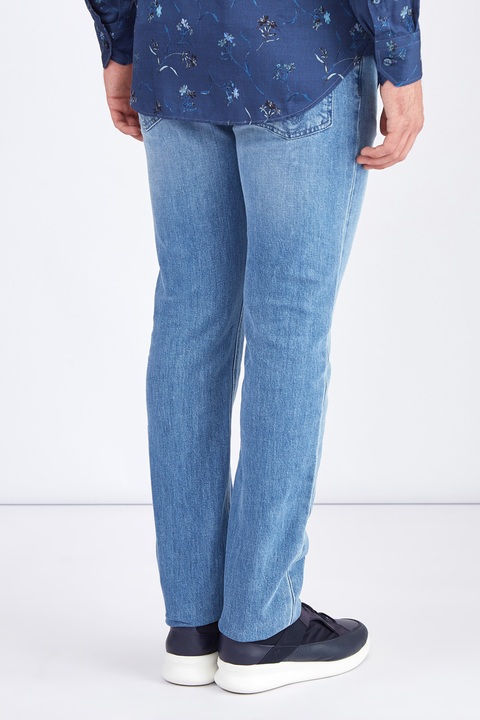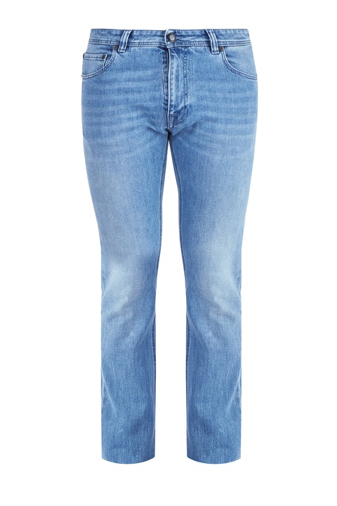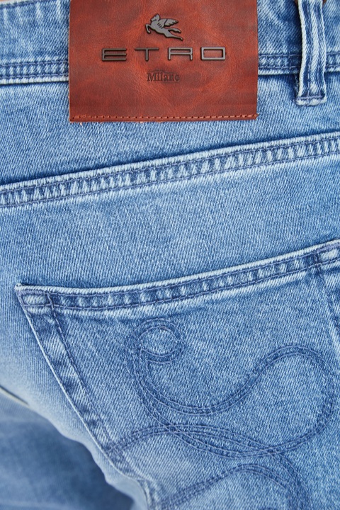 Стильные мужские джинсы облегающего кроя из коллекции осень-зима Etro выполнены из плотного эластичного денима на основе хлопка в светло-голубом оттенке с механическим вымыванием красителя. Фирменный этнический стиль изделию придает вышивка с узором пейсли на задних карманах. Брендированная фурнитура украшена цветной эмалью. Модель оснащена притачным поясом с петлями для ремня и классической застежкой на пуговицу и молнию. Кожаная нашивка коньячного тона и прострочка нитями синего цвета с металлической монограммой и символом компании завершает дизайн. Сделано в Италии.