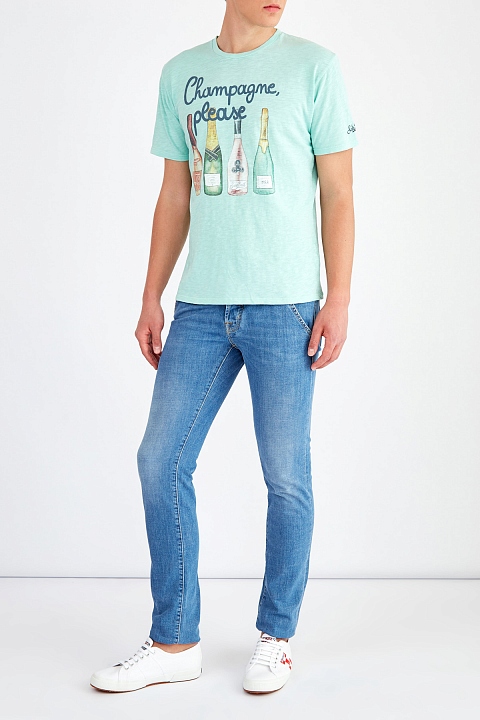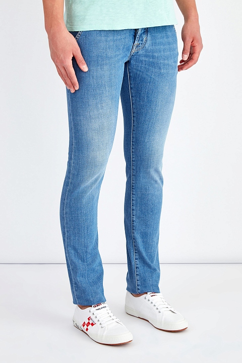 Светлые джинсы облегающего кроя от Jacob Cohen произведены из плотного денима. Уникальный оттенок был достигнут при помощи натурального красителя индиго, а выбеленные области, которые придают ткани объемный эффект, созданы мастерами бренда вручную. Модель с оригинальными «американскими» карманами по бокам дополнена фурнитурой Silver-plated. Нашивка из меха пони с вышитым логотипом завершает дизайн. Сделано в Италии.