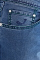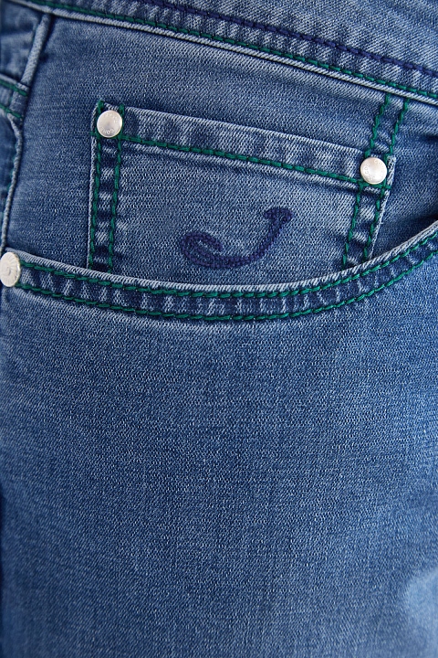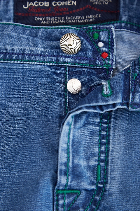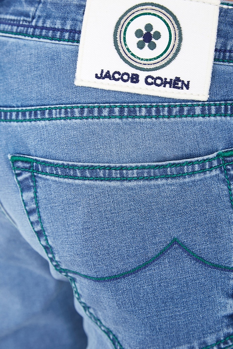 Классические мужские джинсы Jacob Cohen прямого кроя выполнены из износостойкого японского хлопкового денима, окрашенного натуральным красителем индиго и осветленного до приглушенного голубого тона. Модель выполнена из ткани с особой ароматической пропиткой и оформлена прострочкой цветными нитями в изумрудной гамме. Изделие с конструктивным поясом с петлями для ремня и пятью традиционными карманами. Металлическая фурнитура с матовым серебряным покрытием «Silver-plated» декорирована фирменной символикой бренда. Сделано в Италии.
