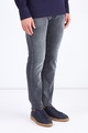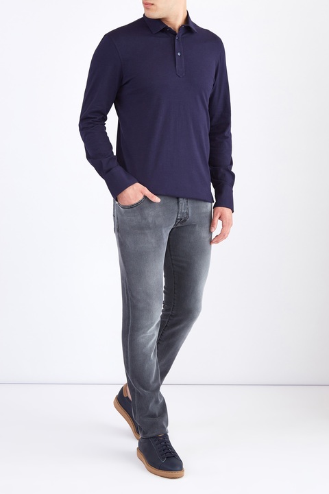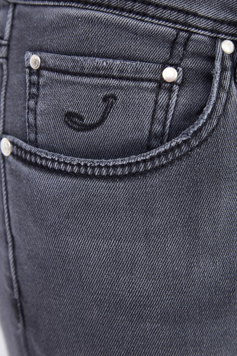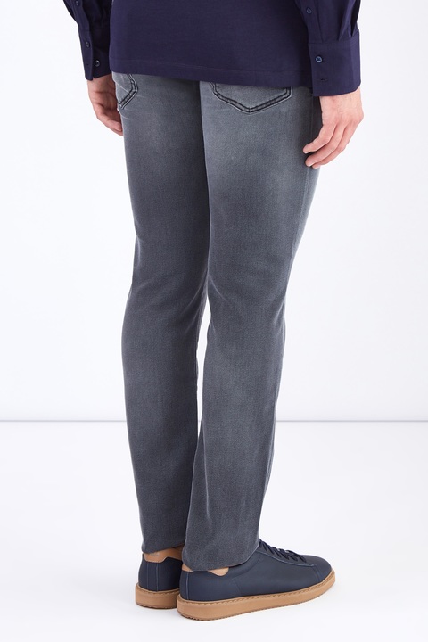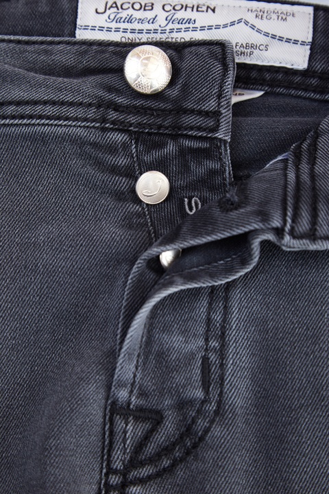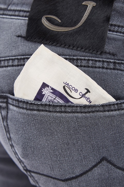 Стильные мужские джинсы кроя Comfort Fit 622 из коллекции осень-зима Jacob Cohen из плотного, стойкого к изнашиванию японского денима Kurabo тонированного в дымчатый серый цвет с осветленными участками, созданными в технологии механического вымывания красителя. Модель с прострочкой тамбурным швом черными нитями и особой пропиткой с изысканным ароматом. Изделие с фирменной фурнитурой с серебряным гальваническим покрытием «Silver-plated», которую рекомендуется протирать специальным хлопковым платком, прилагающимся в комплекте. Сделано в Италии.