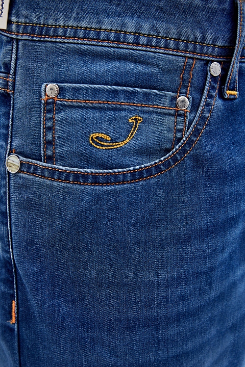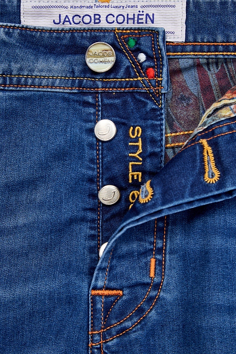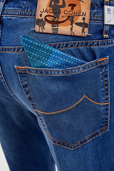 Джинсы ручной работы от Jacob Cohen выполнены из эластичного хлопкового денима в классическом синем оттенке. Ткань с выверенным составом обеспечивает комфорт в движении. Изделие дополнено яркой подкладкой с этническим принтом. Образ в стиле casual создают оригинальные детали: контрастная прострочка швов цветными нитями и нашивка из кожи на поясе. Детали: застежка на пуговицы, фирменный платок для ухода за фурнитурой в комплекте.
