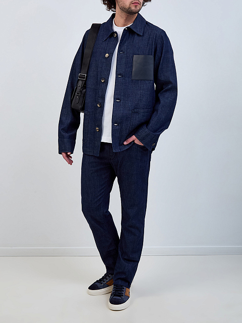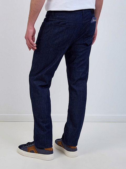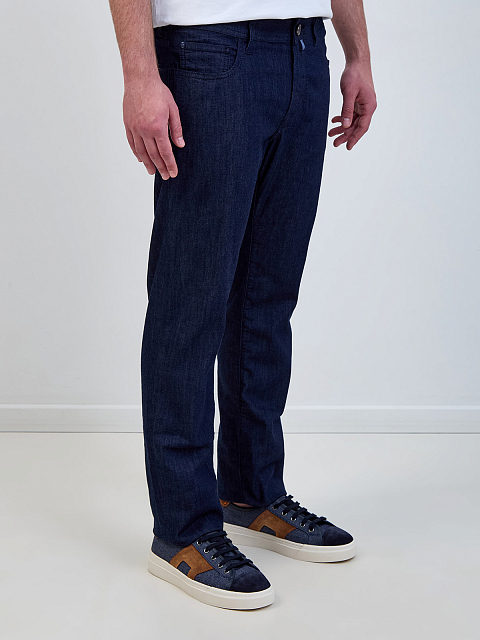 Лаконичные джинсы от Jacob Cohen выполнены из эластичного денима, окрашенного при помощи натурального красителя индиго. Переплетение нитей синего и белого тонов создают интересный неоднородный эффект по поверхности. Отполированная вручную фурнитура дополнена фирменным напылением. Детали: застежка на молнию, пять карманов, нашивка из меха пони на спинке, вышивка ручной работы за ширинкой. Сделано в Италии.