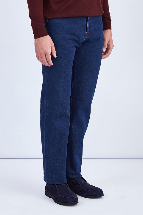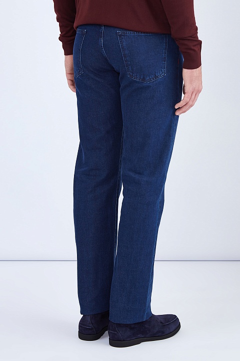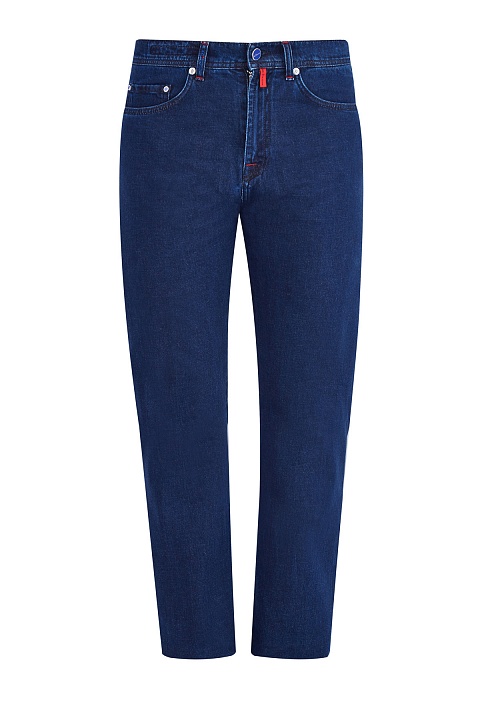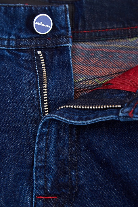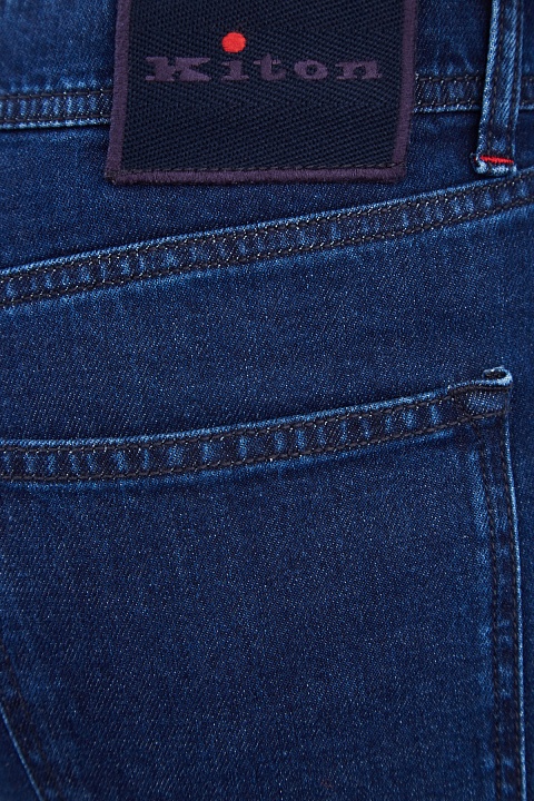 Джинсы ручной работы от Kiton выполнены из плотного денима в традиционном оттенке индиго. Благодаря эластичным волокнам в составе ткань не стесняет движений. Фурнитура вручную отполирована и дополнена цветными эмалевыми вставками, фирменный стиль подчеркивают декоративные строчки красного цвета. Детали: внутренняя принтованная отделка, фактурная нашивка с вышитой монограммой на поясе. Сделано в Италии.