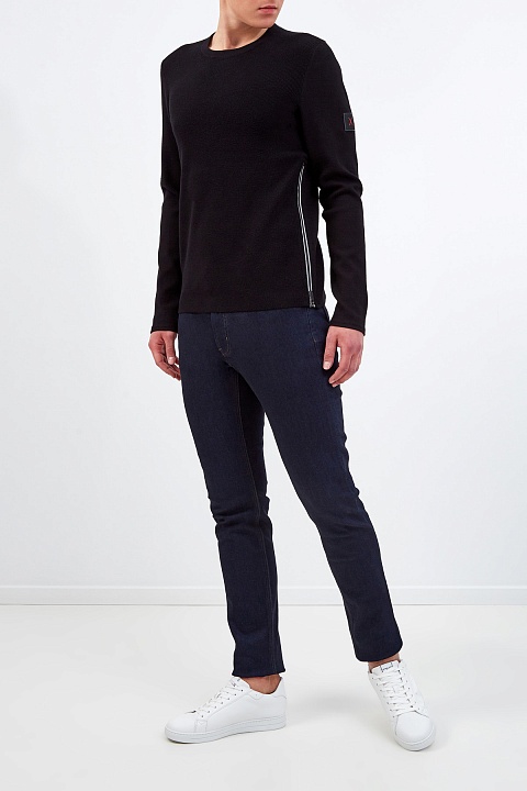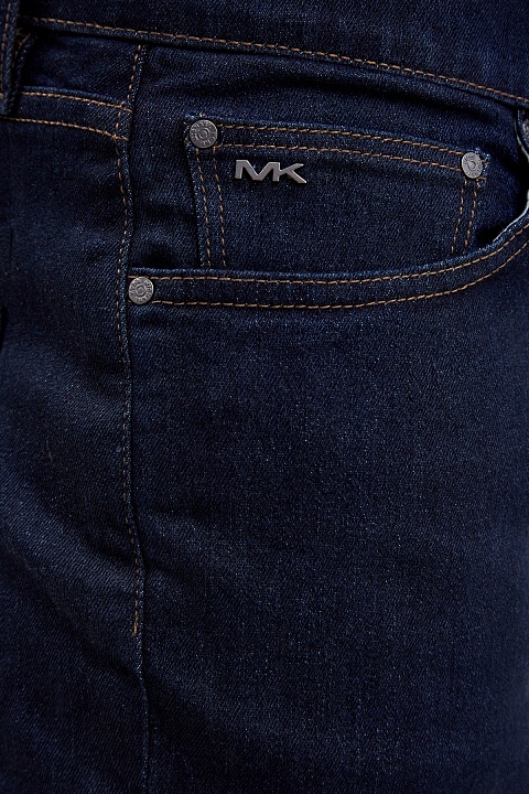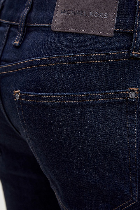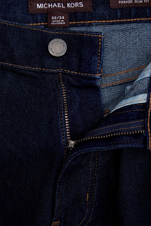 Джинсы-slim от Michael Kors полностью выполнены из хлопкового денима. Однородный оттенок индиго дополнен прострочкой швов нитью табачного цвета. Фирменный стиль подчеркнут литым логотипом бренда. Детали: пять карманов, притачной широкий пояс с петлями для ремня и фирменной нашивкой, классическая средняя посадка, фурнитура с матовым серебристым напылением.